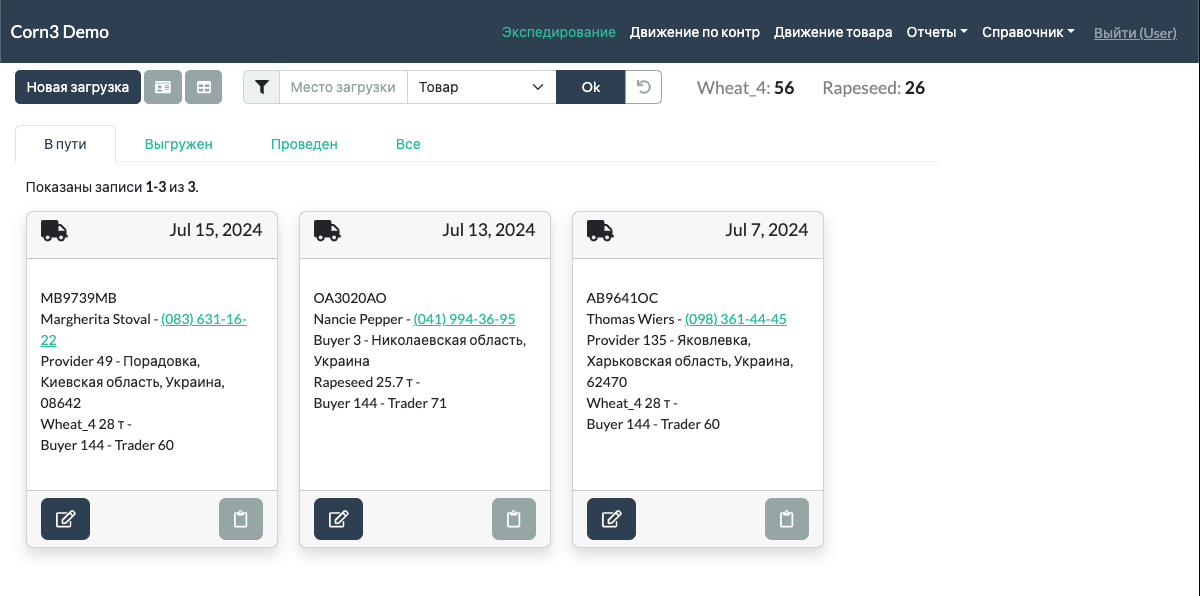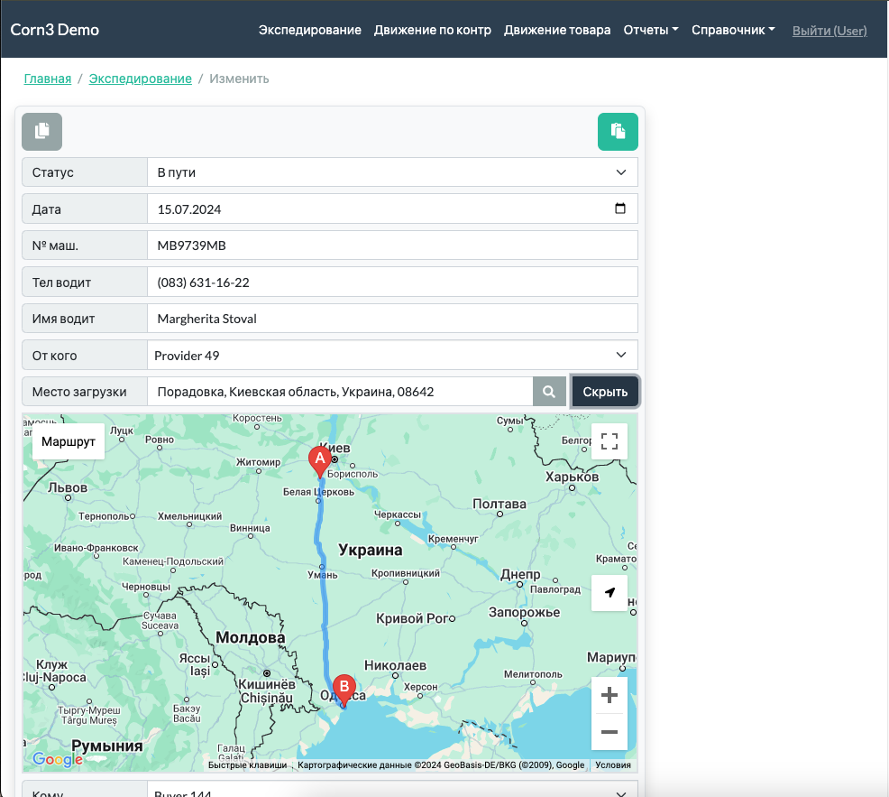 Раздел позволяет отслеживать движение грузов, с полной информацией о перевозчике, местом загрузки и выгрузки. Если в справочнике "Трейдер" указана геопозиция, то можно проложить маршрут по встроенной карте. У каждой позиции устанавливается состояние: "В пути", "Выгружено", "Проведено".